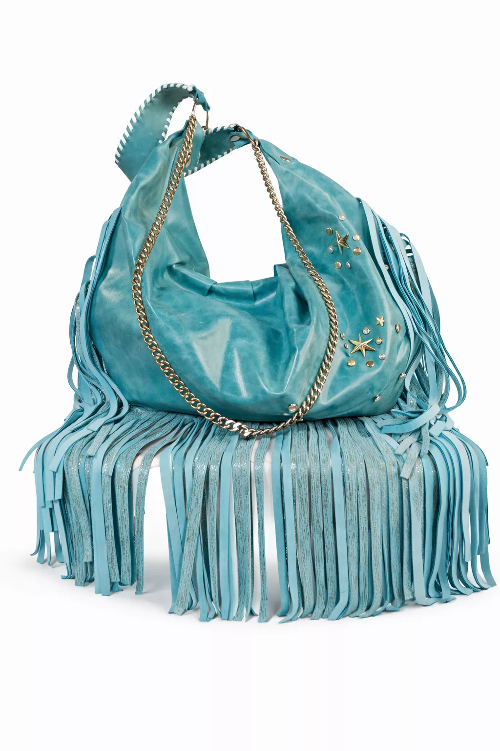 Precioso bolso confeccionado a mano color turquesa con flecos, tiene brillo y tachuelas y te da un look espectacular.