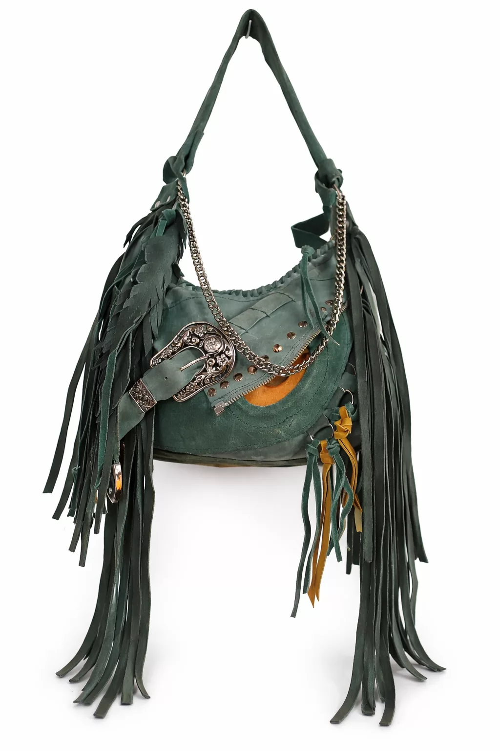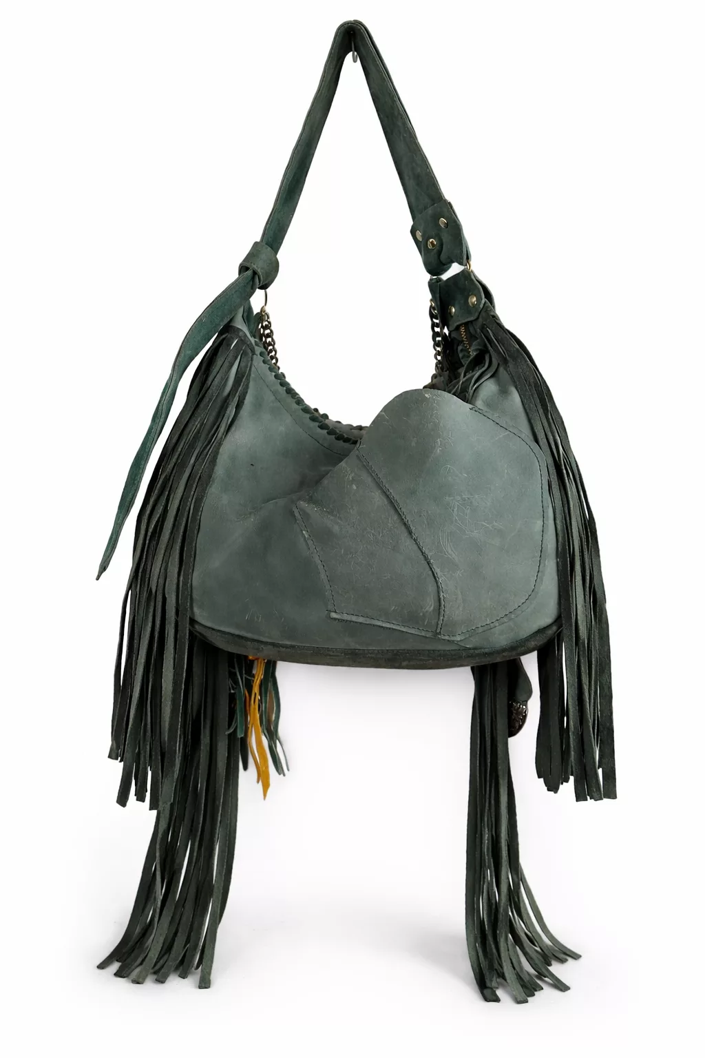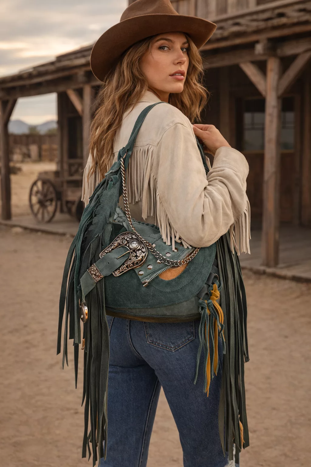 El diseño se define por sus flecos de cuero, que aportan movimiento y un aire libre y expresivo, sin perder equilibrio ni funcionalidad. La forma es cómoda y envolvente, ideal para el día a día, mientras que los herrajes metálicos aportan resistencia y contraste visual.
