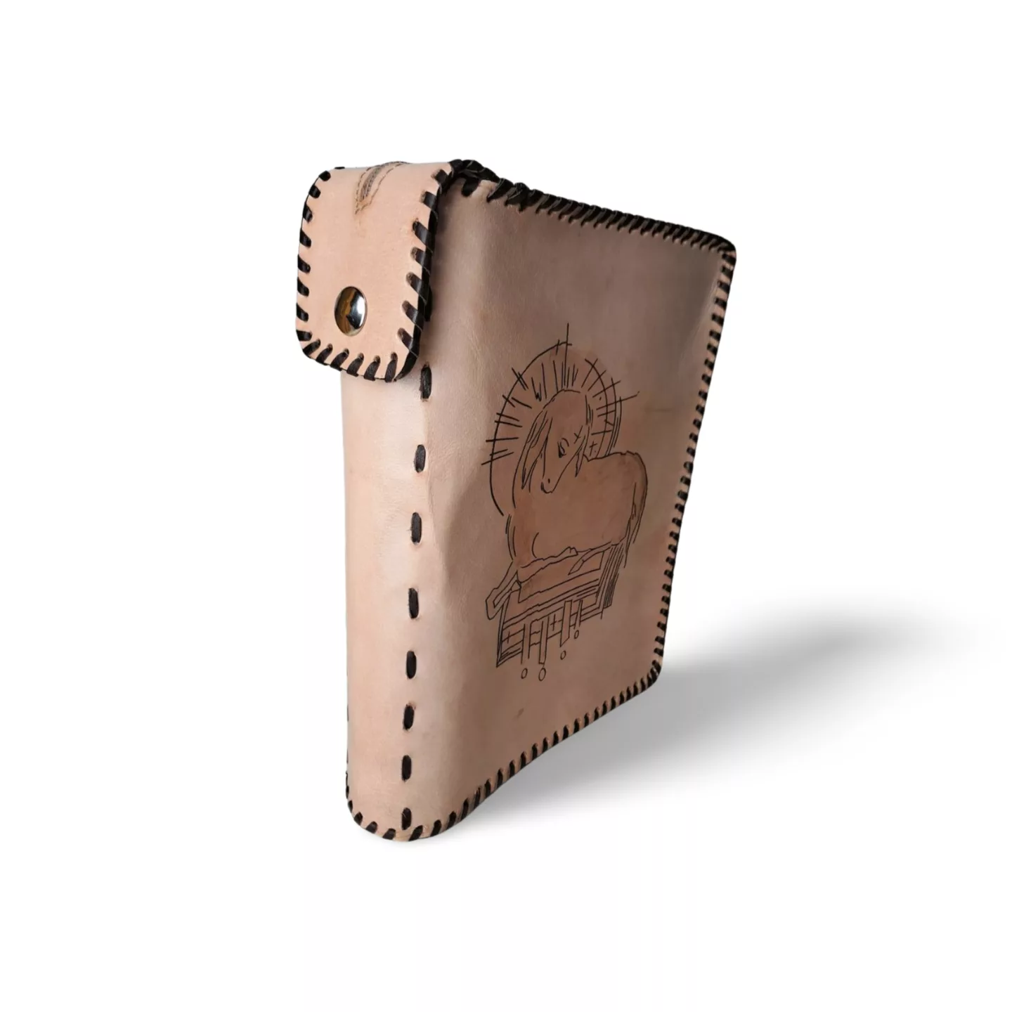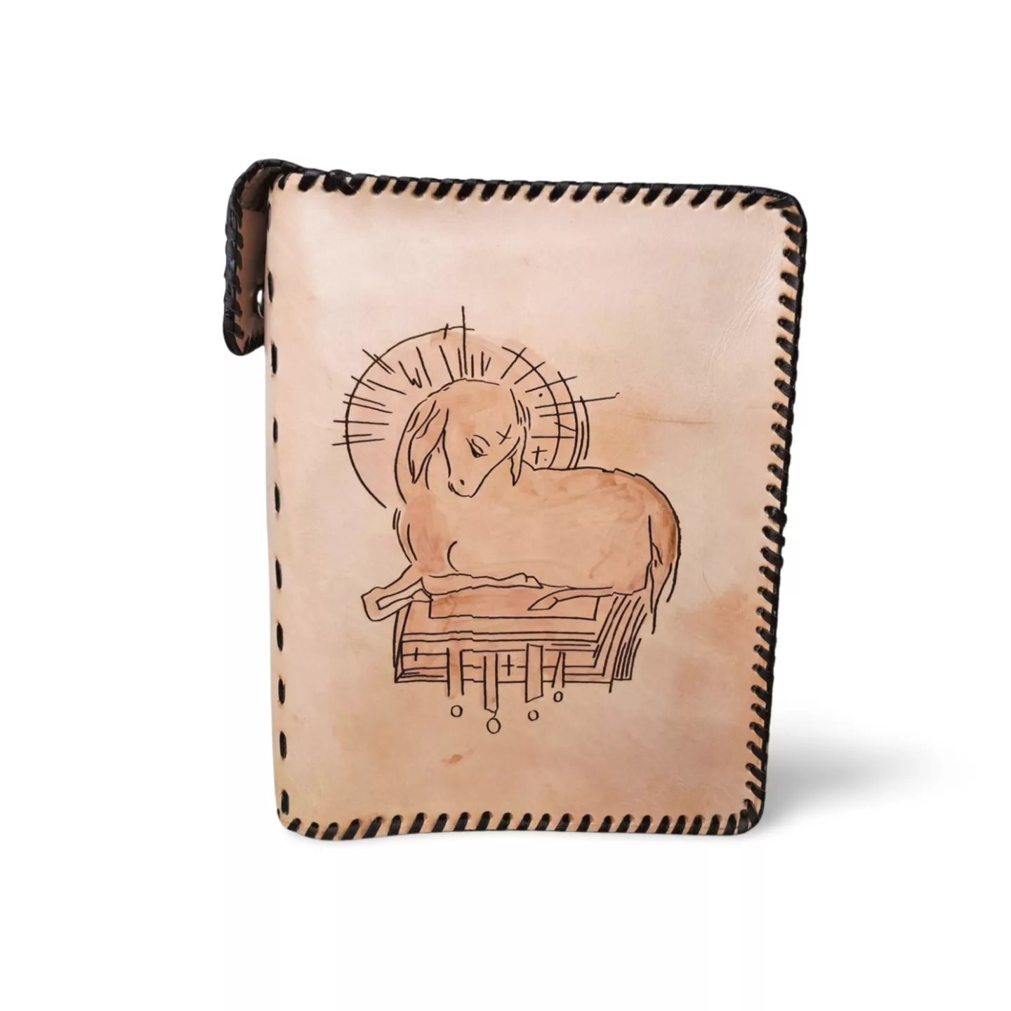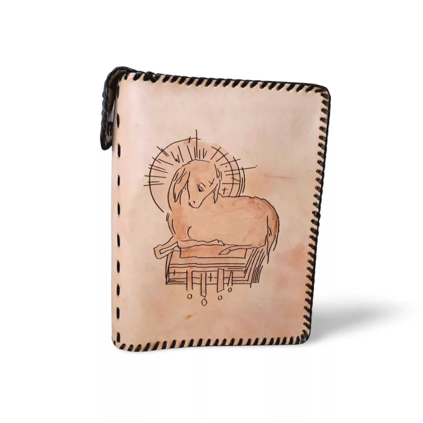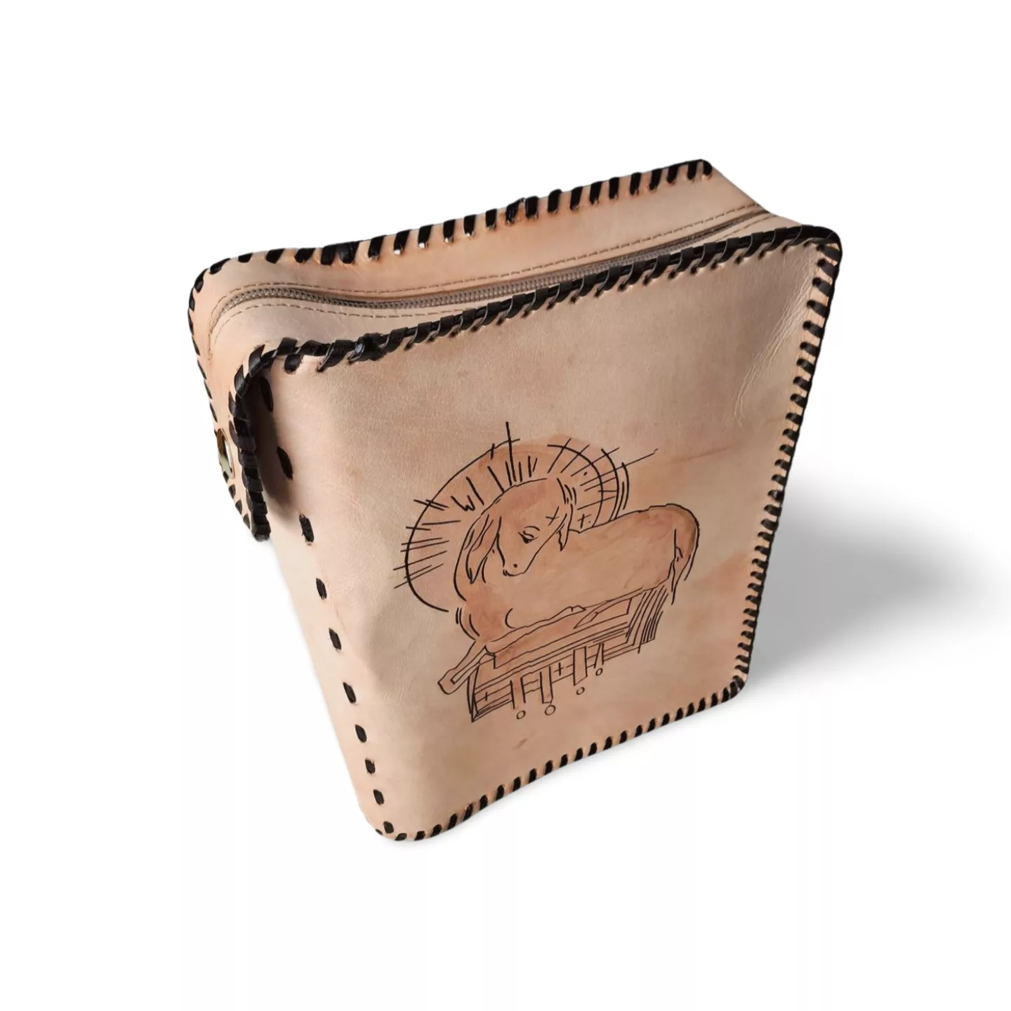 Hecha para quienes aman la fuerza del cuero en su estado más puro, esta funda artesanal de cuero rústico combina carácter y tradición. Cada pieza es cortada, grabada y cosida a mano, empleando tireta de cuero oscuro para reforzar tanto el cuerpo como el lomo, siguiendo técnicas tradicionales que garantizan firmeza y durabilidad. Su estructura más rígida y su cierre de cremallera protegen tu libro de oración con elegancia y sencillez. En la portada, pirograbado de simbolo de