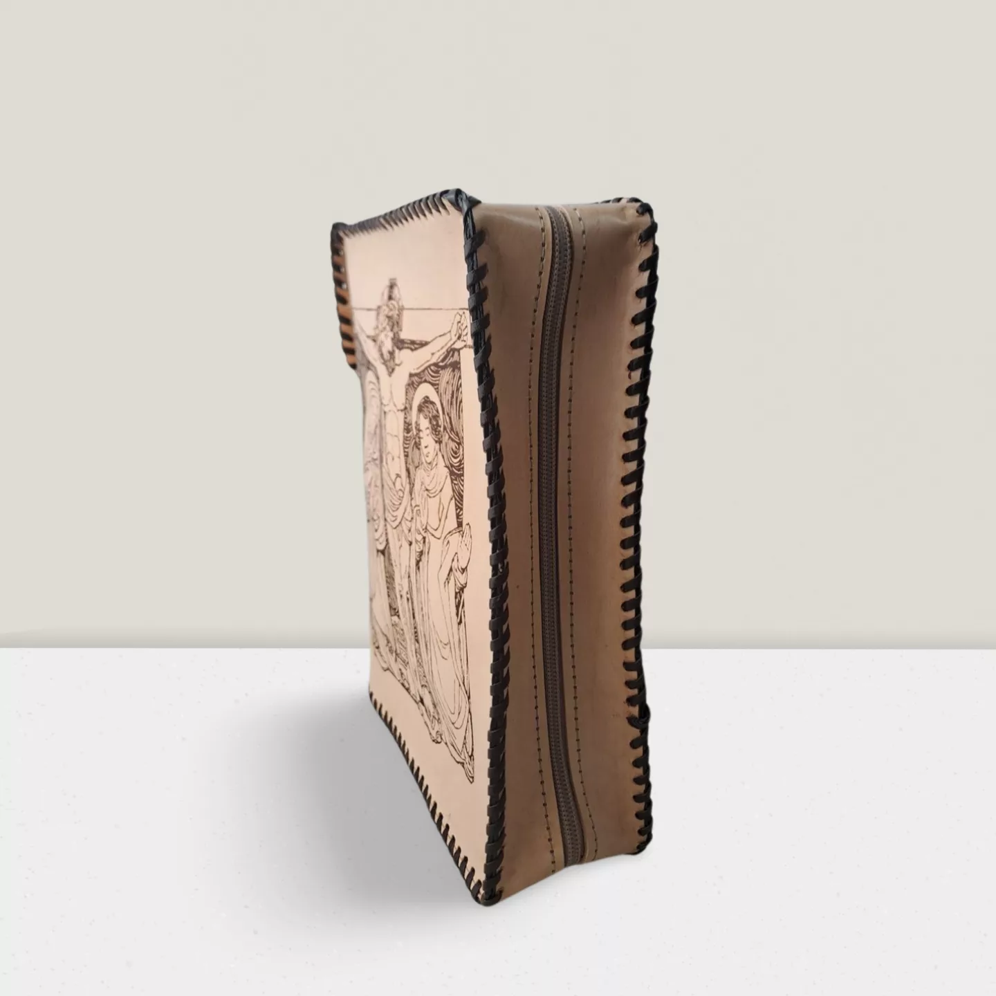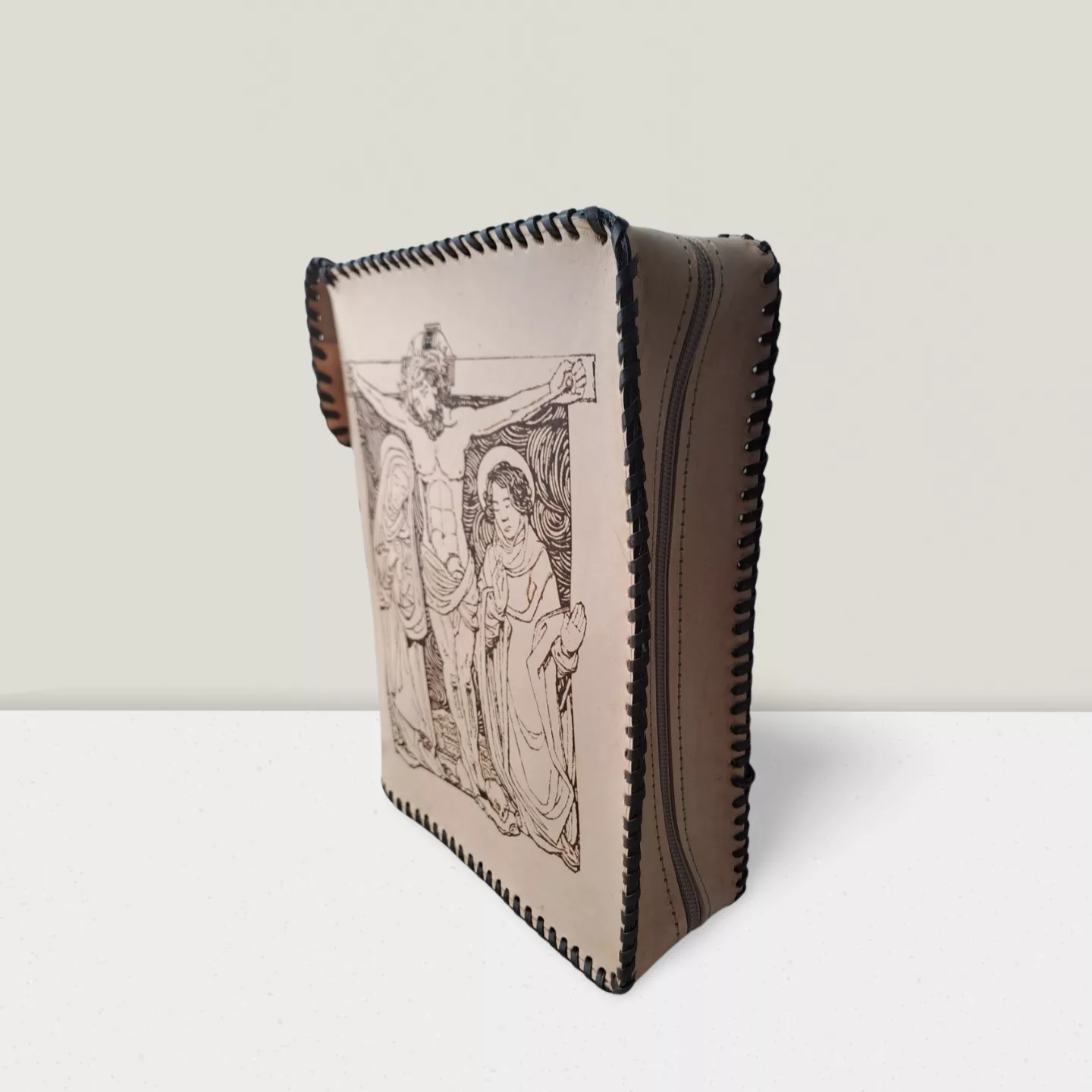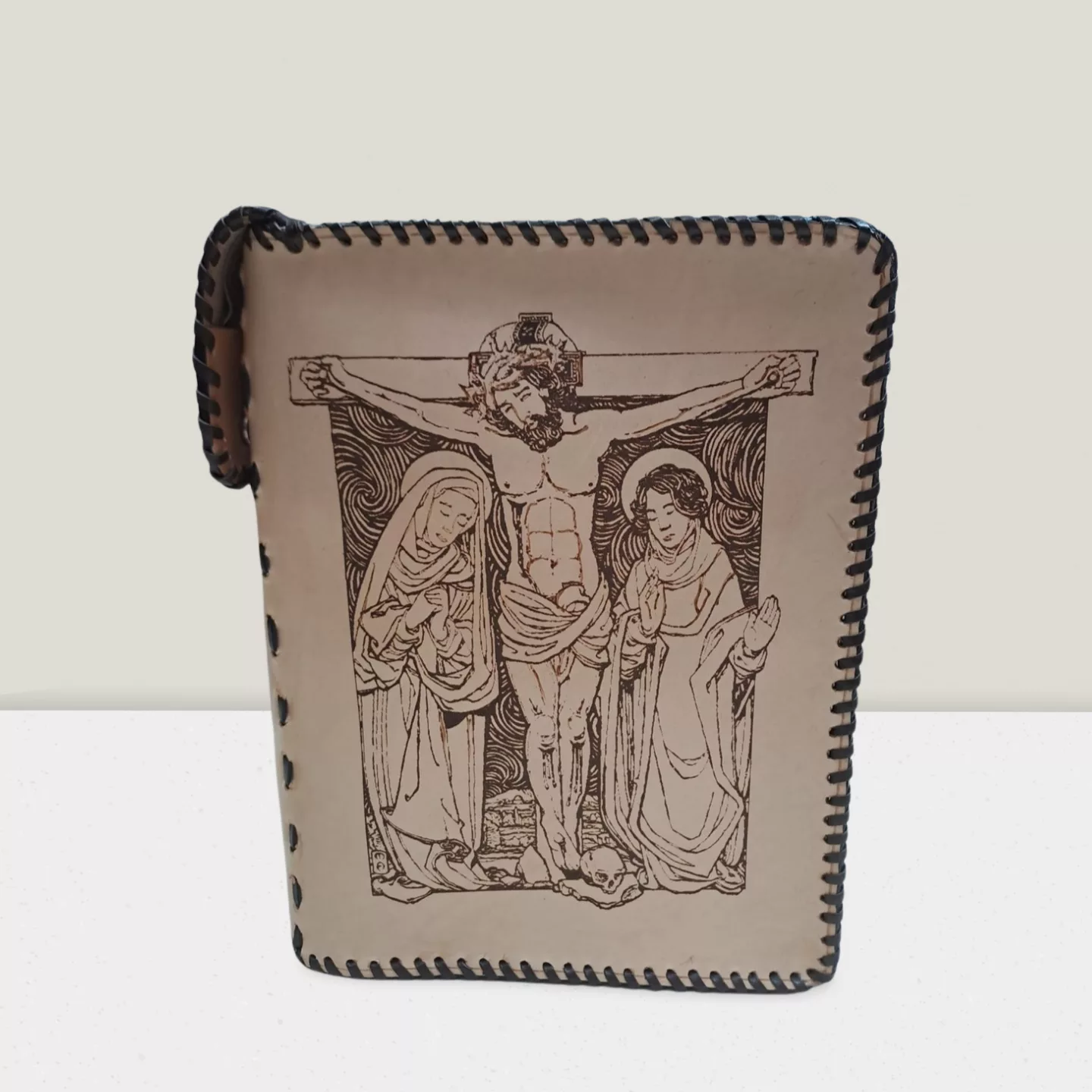 Hecha para quienes aman la fuerza del cuero en su estado más puro, esta funda artesanal de cuero rústico combina carácter y tradición. Cada pieza es cortada, grabada y cosida a mano, empleando tireta de cuero oscuro para reforzar tanto el cuerpo como el lomo, siguiendo técnicas tradicionales que garantizan firmeza y durabilidad. Su estructura más rígida y su cierre de cremallera protegen tu libro de oración con elegancia y sencillez. En la portada, pirograbado de la Crucifixión.