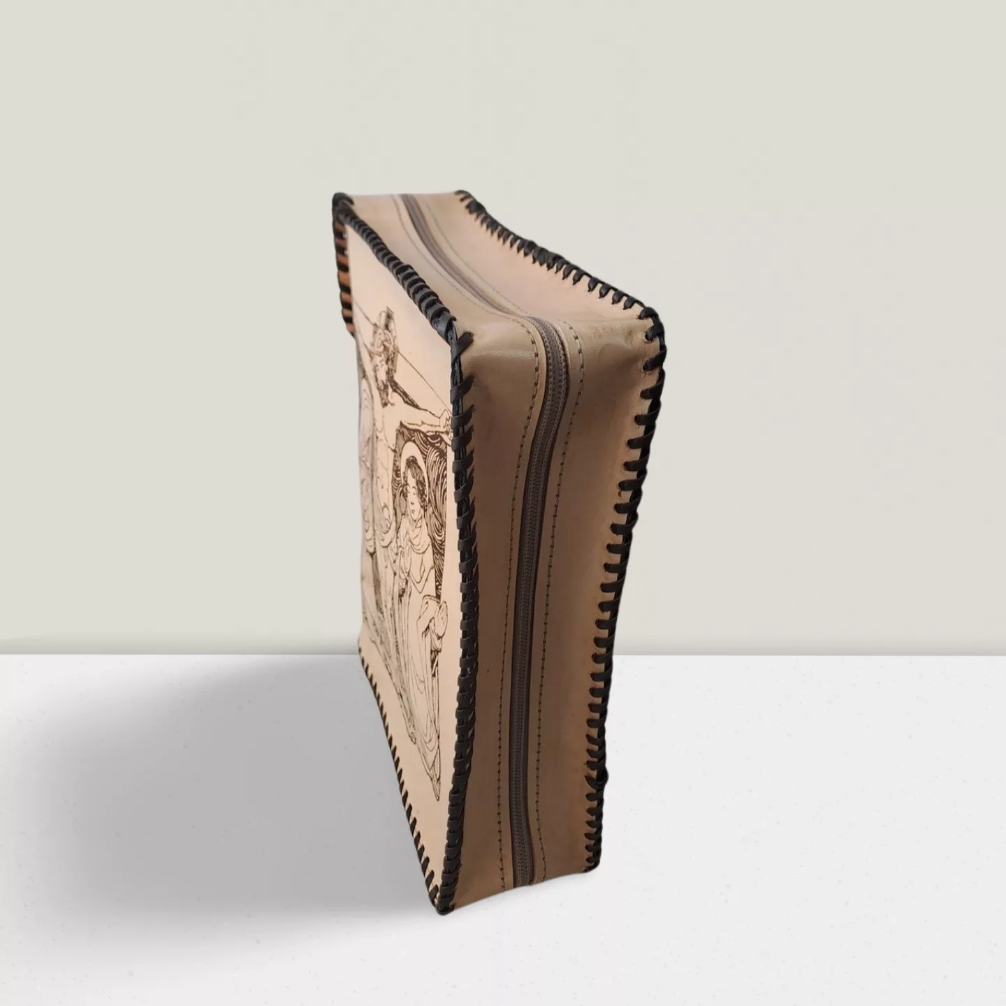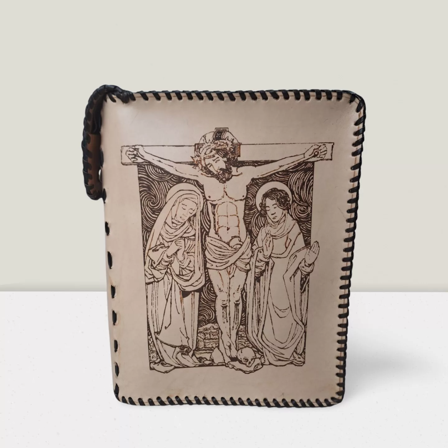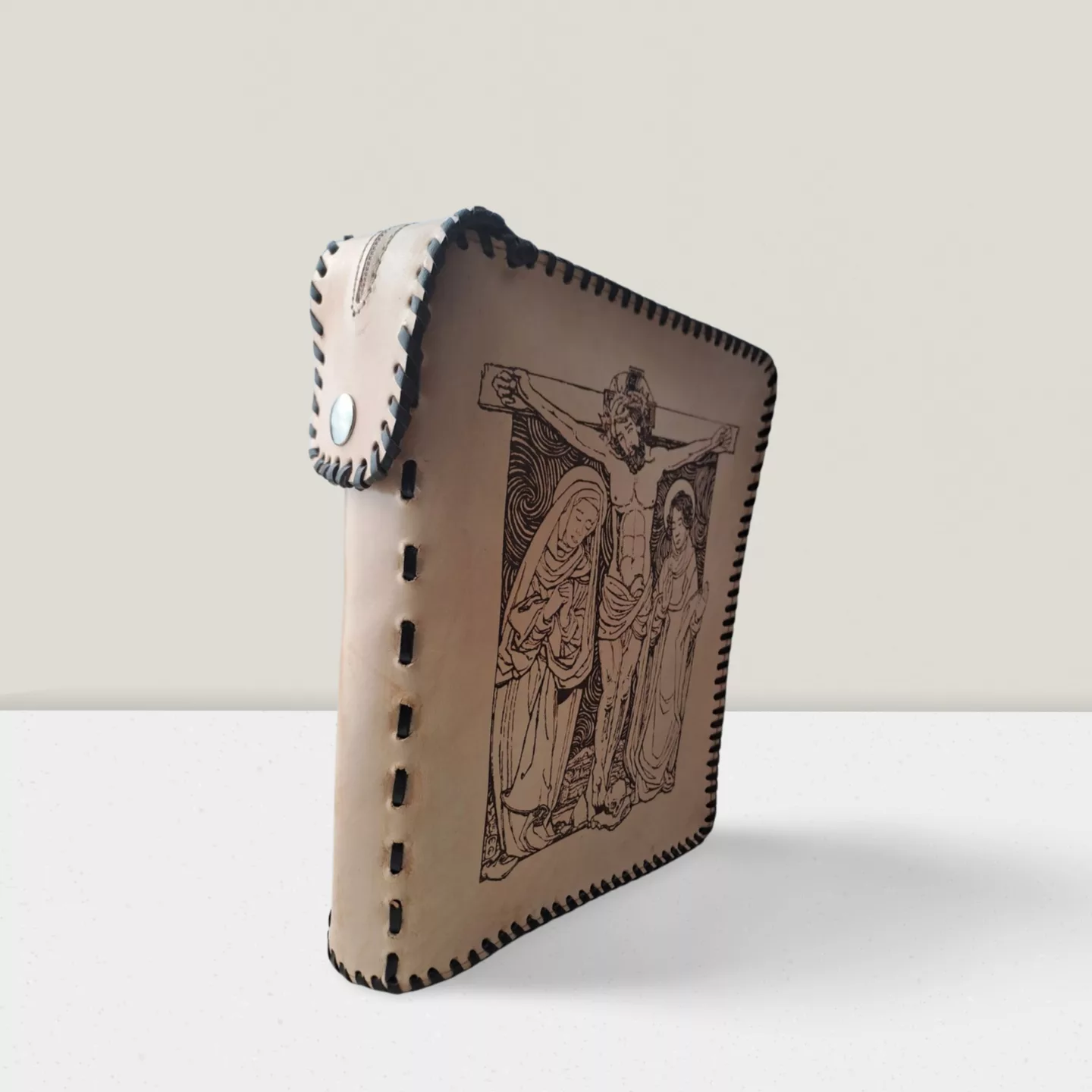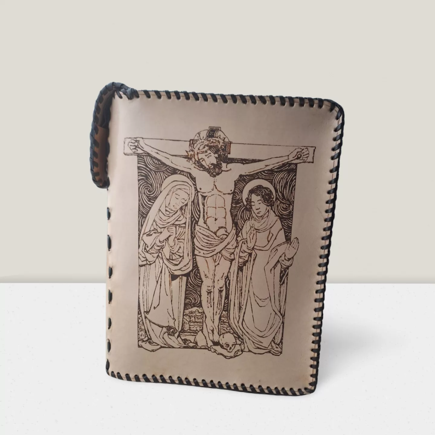 Hecha para quienes aman la fuerza del cuero en su estado más puro, esta funda artesanal de cuero rústico combina carácter y tradición. Cada pieza es cortada, grabada y cosida a mano, empleando tireta de cuero oscuro para reforzar tanto el cuerpo como el lomo, siguiendo técnicas tradicionales que garantizan firmeza y durabilidad. Su estructura más rígida y su cierre de cremallera protegen tu libro de oración con elegancia y sencillez. En la portada, pirograbado de la Crucifixión.