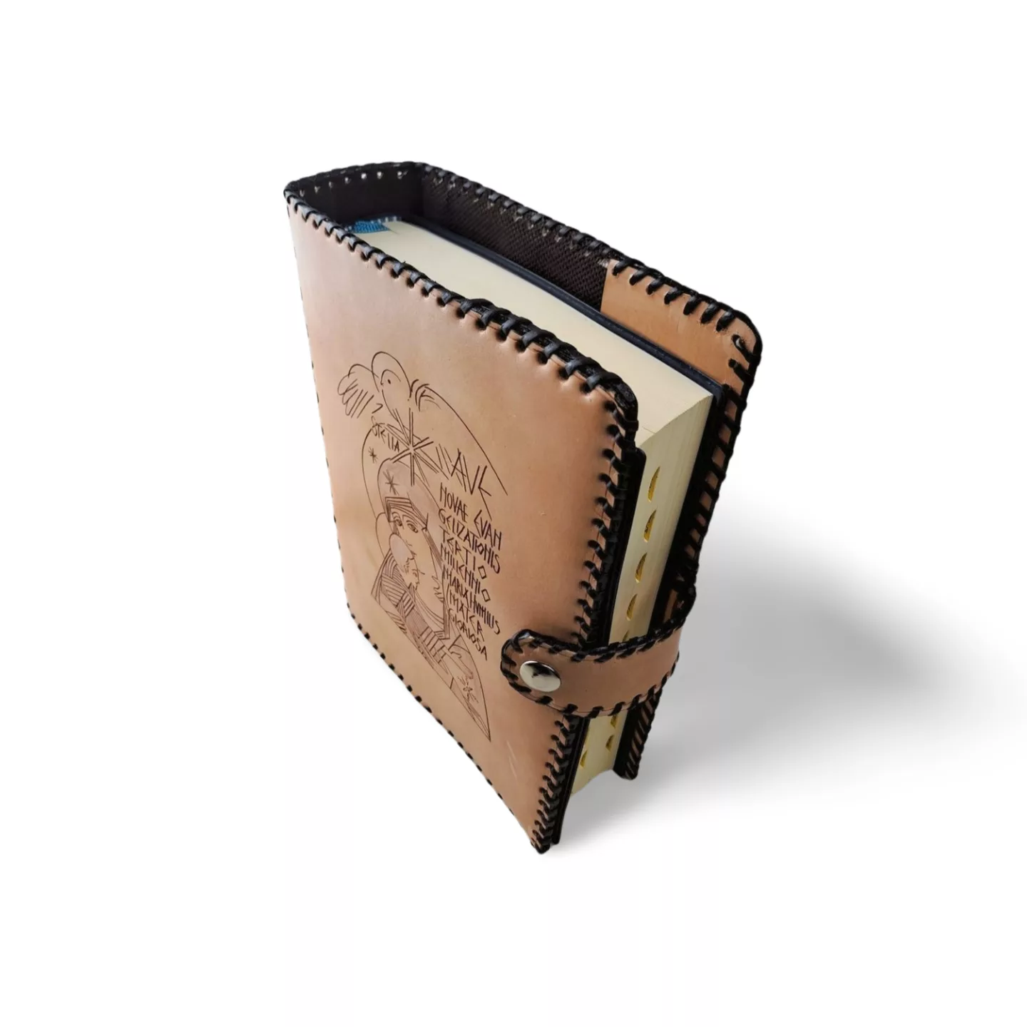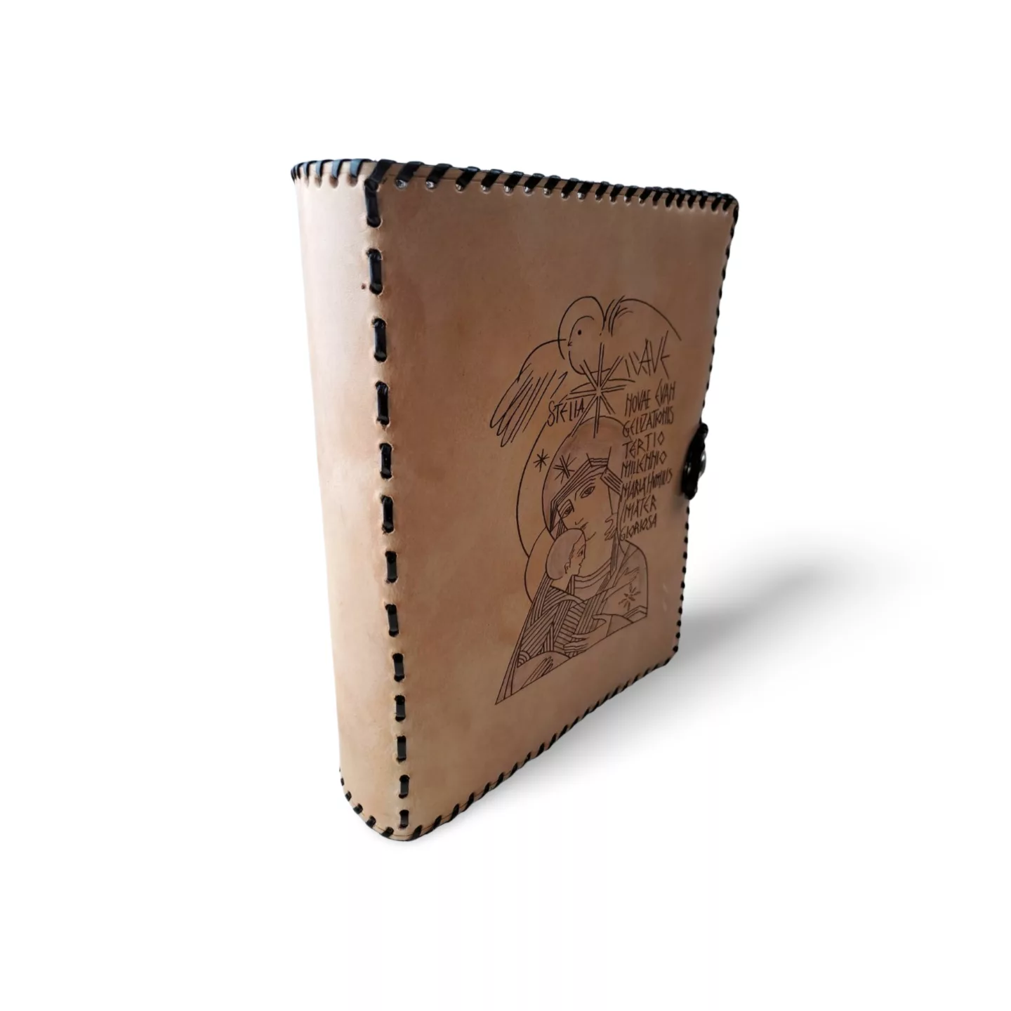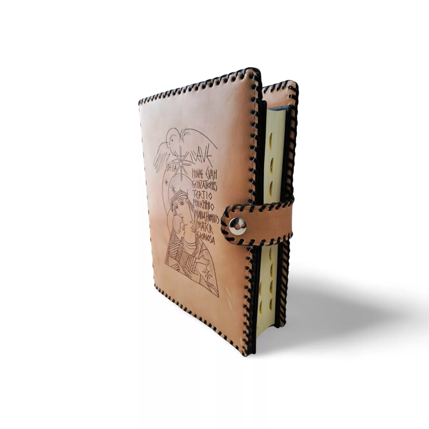 Hecha para quienes aman la fuerza del cuero en su estado más puro, esta funda artesanal de cuero rústico combina carácter y tradición. Cada pieza es cortada, grabada y cosida a mano, empleando tireta de cuero oscuro para reforzar tanto el cuerpo como el lomo, siguiendo técnicas tradicionales que garantizan firmeza y durabilidad. Su estructura más rígida y su cierre de cremallera protegen tu libro de oración con elegancia y sencillez. En la portada, pirograbado a mano de la Virgen del Silencio. Cierre de la funda con broche a presión.