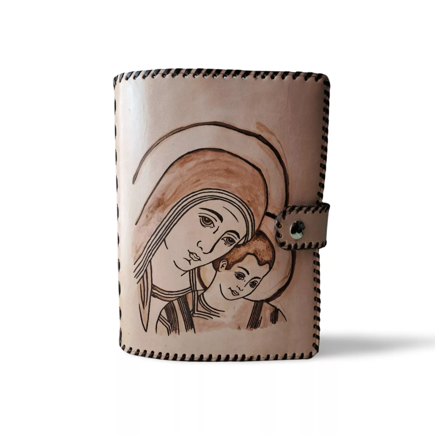 • Grabado de portada personalizable mediante pirograbado artesanal. Este diseño: Virgen del Tercer Milenio.