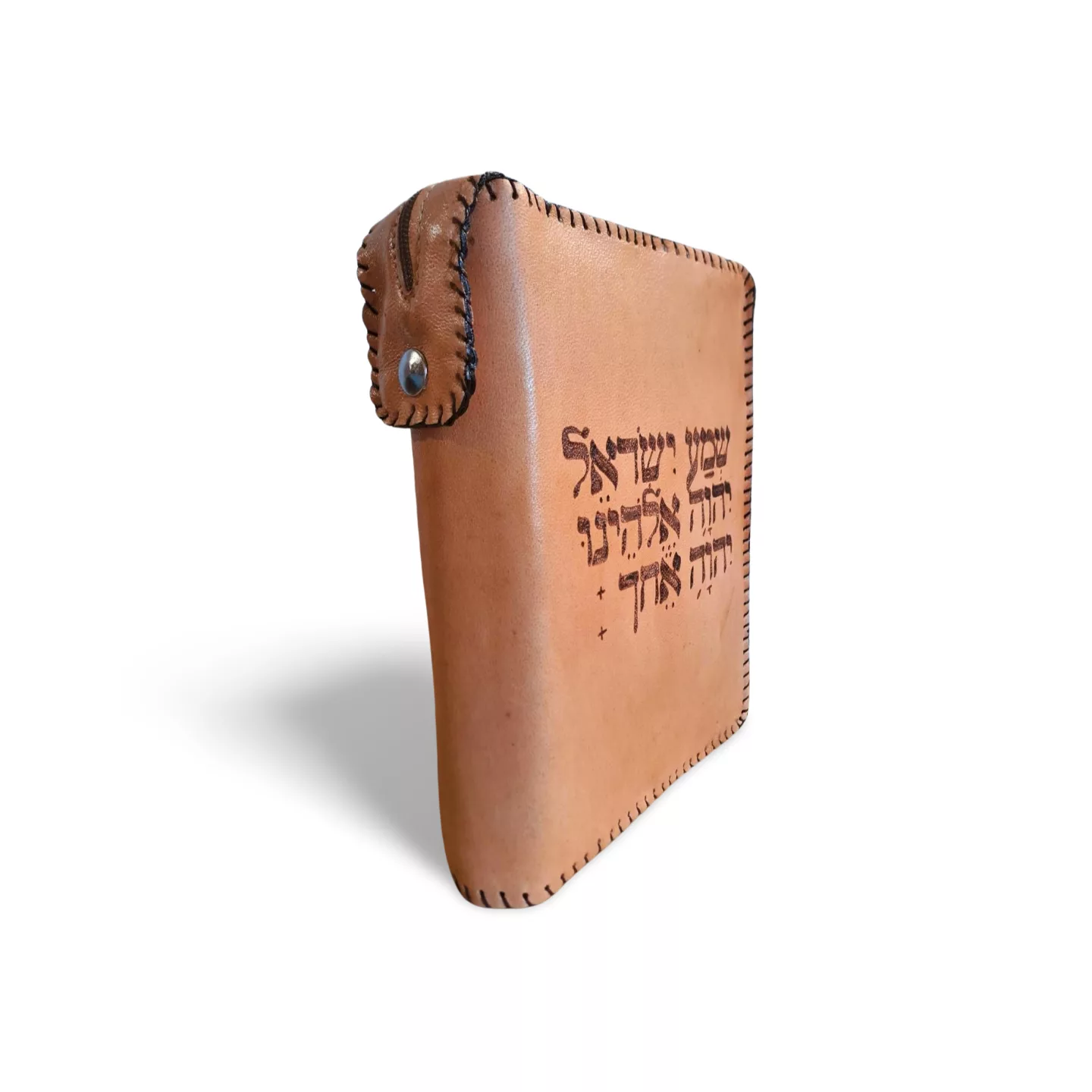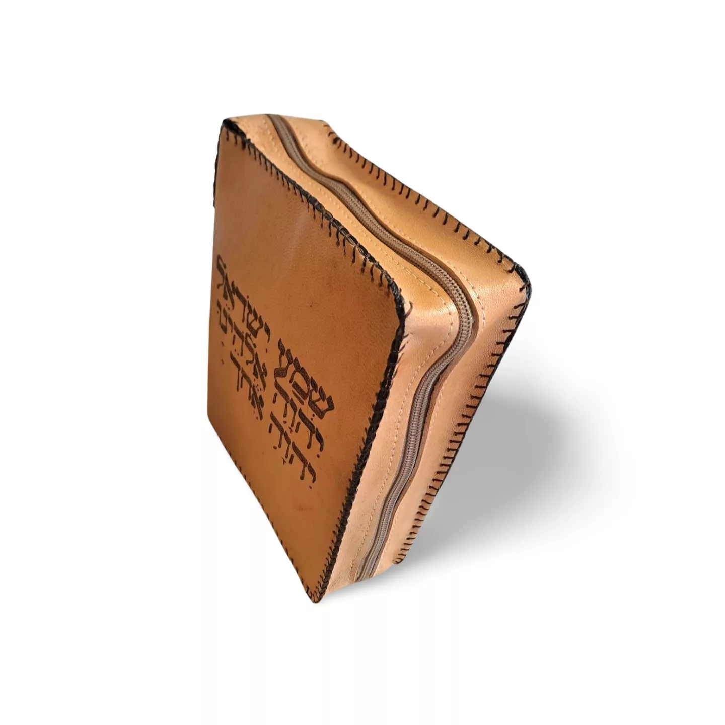 Hecha a mano en cuero natural de alta calidad con hilo encerado marrón y forro interior resistente, esta funda protege tu Biblia con cierre de cremallera. El Shemá en hebreo grabado añade un toque de espiritualidad y elegancia que hace cada lectura un momento único.